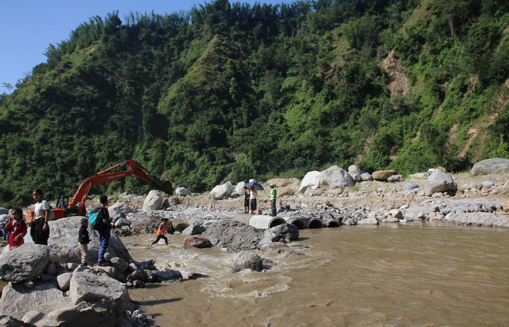 यात्रुले करिब १५ मिनेट पैदलयात्रा गरेर खोला पार गर्दै आएका छन् । गत बिहीबारदेखि डाइभर्सन र पहुँच मार्ग निर्माणको काम भइरहेको छ । गत वर्षको असोज १२ गते आएको बाढीले यहाँ रहेको सडक पुल बगाएको थियो । सडक पुल बगेपछि यहाँ अस्थायी डाइभर्सनबाट यातायात सञ्चालन हुँदै आएकोमा गत जेठमा स्थायी डाइभर्सन निर्माण गरिएको थियो ।